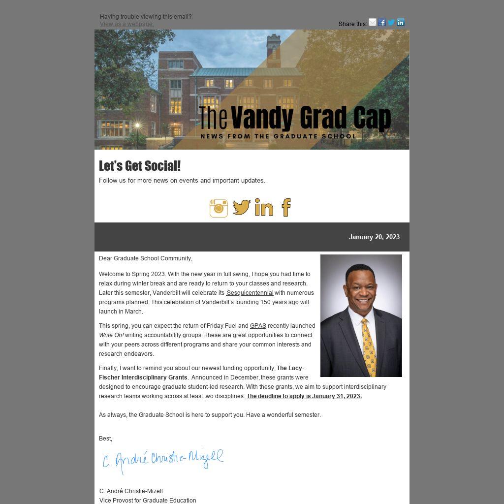 Newsletter SubmissionsTo submit content for this newsletter or to subscribe, please email all relevant information to gradschoolnews@vanderbilt.edu by the 10th day of each month. The newsletter will be published around middle of each month.