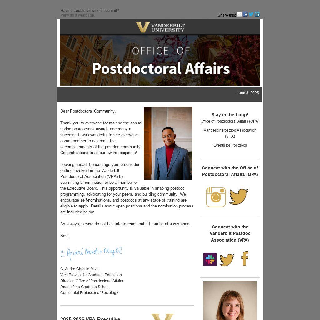Looking ahead, I encourage you to consider getting involved in the Vanderbilt Postdoctoral Association (VPA) by submitting a nomination to be a member of the Executive Board. This opportunity is valuable in shaping postdoc programming, advocating for your peers, and building community. We encourage self-nominations, and postdocs at any stage of training are eligible to apply. Details about open positions and the nomination process are included below.
