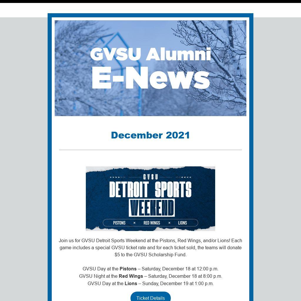 Join us for GVSU Detroit Sports Weekend at the Pistons, Red Wings, and/or Lions! Each game includes a special GVSU ticket rate and for each ticket sold, the teams will donate $5 to the GVSU Scholarship Fund.