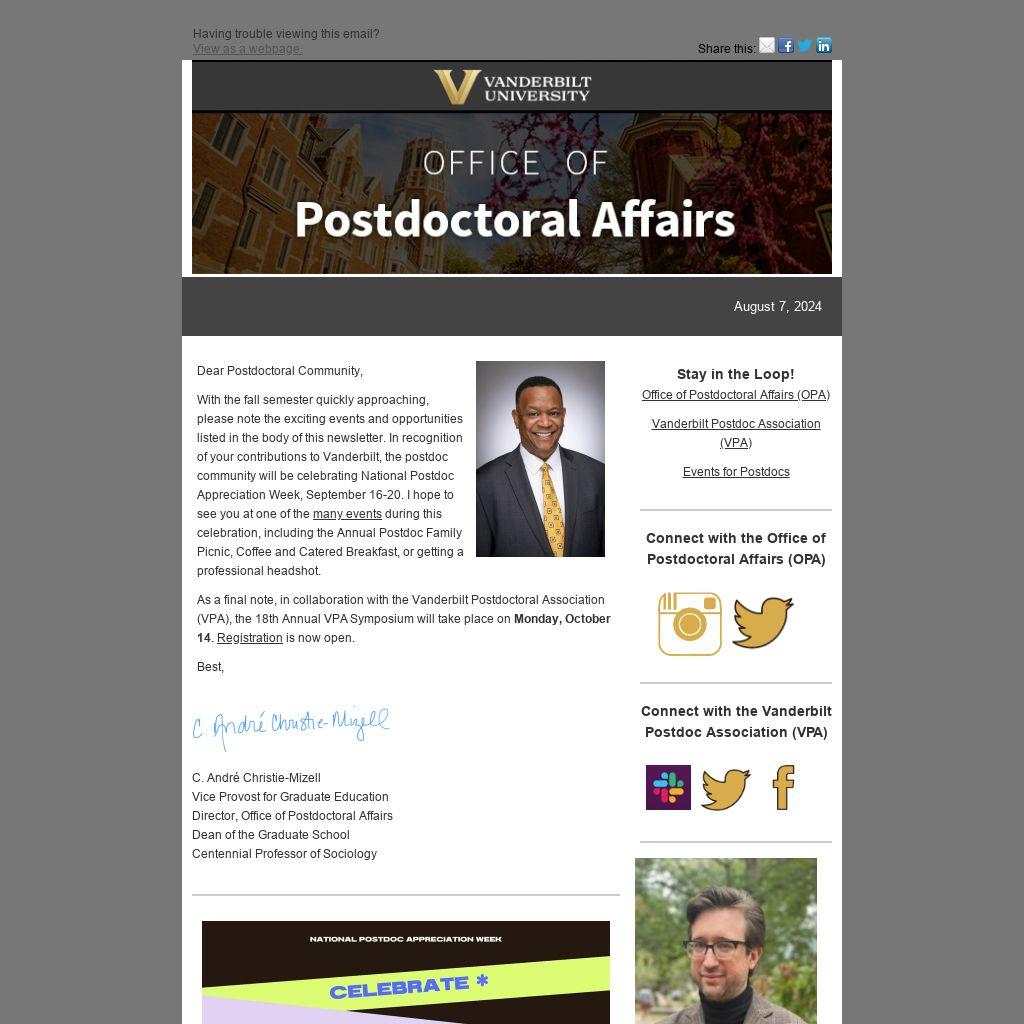 With the fall semester quickly approaching, please note the exciting events and opportunities listed in the body of this newsletter. In recognition of your contributions to Vanderbilt, the postdoc community will be celebrating National Postdoc Appreciation Week, September 16-20. I hope to see you at one of the many events during this celebration, including the Annual Postdoc Family Picnic, Coffee and Catered Breakfast, or getting a professional headshot.