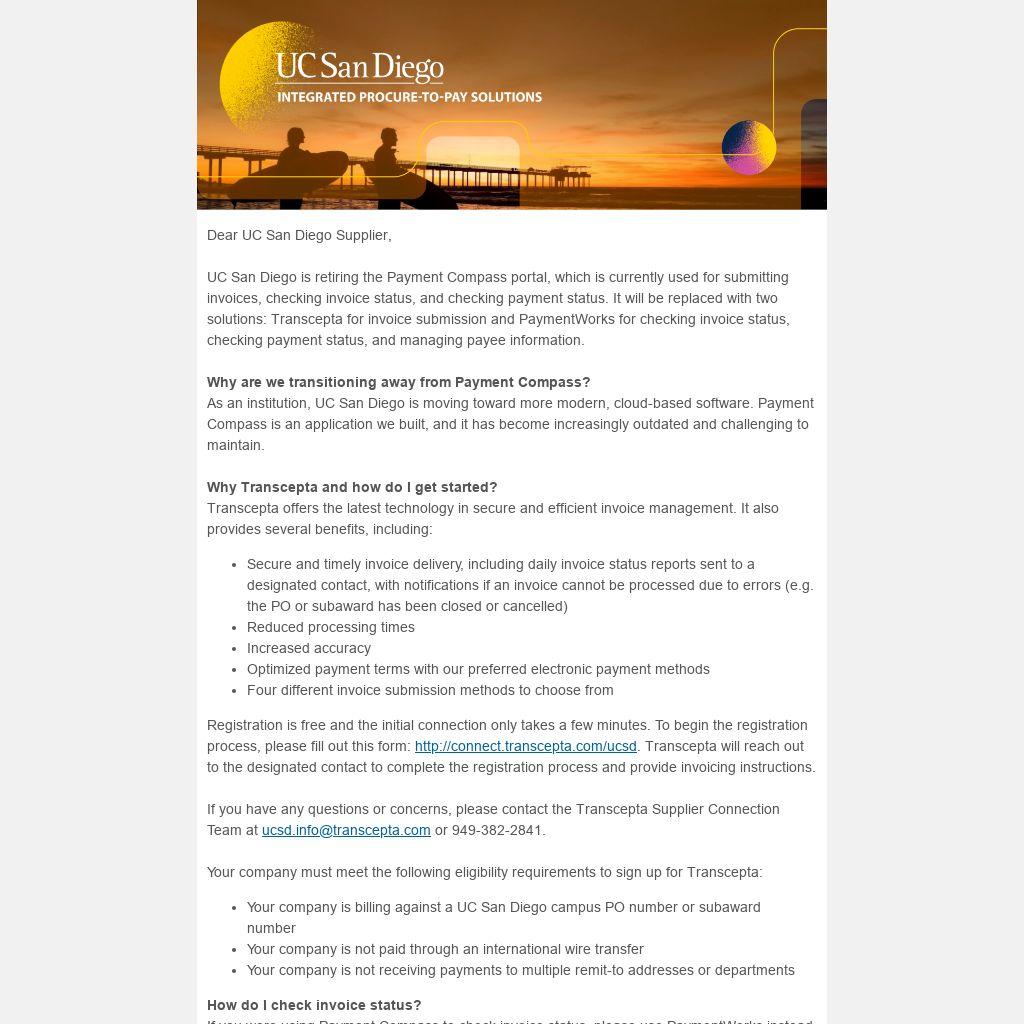 UC San Diego is retiring the Payment Compass portal, which is currently used for submitting invoices, checking invoice status, and checking payment status. It will be replaced with two solutions: Transcepta for invoice submission and PaymentWorks for checking invoice status, checking payment status, and managing payee information.