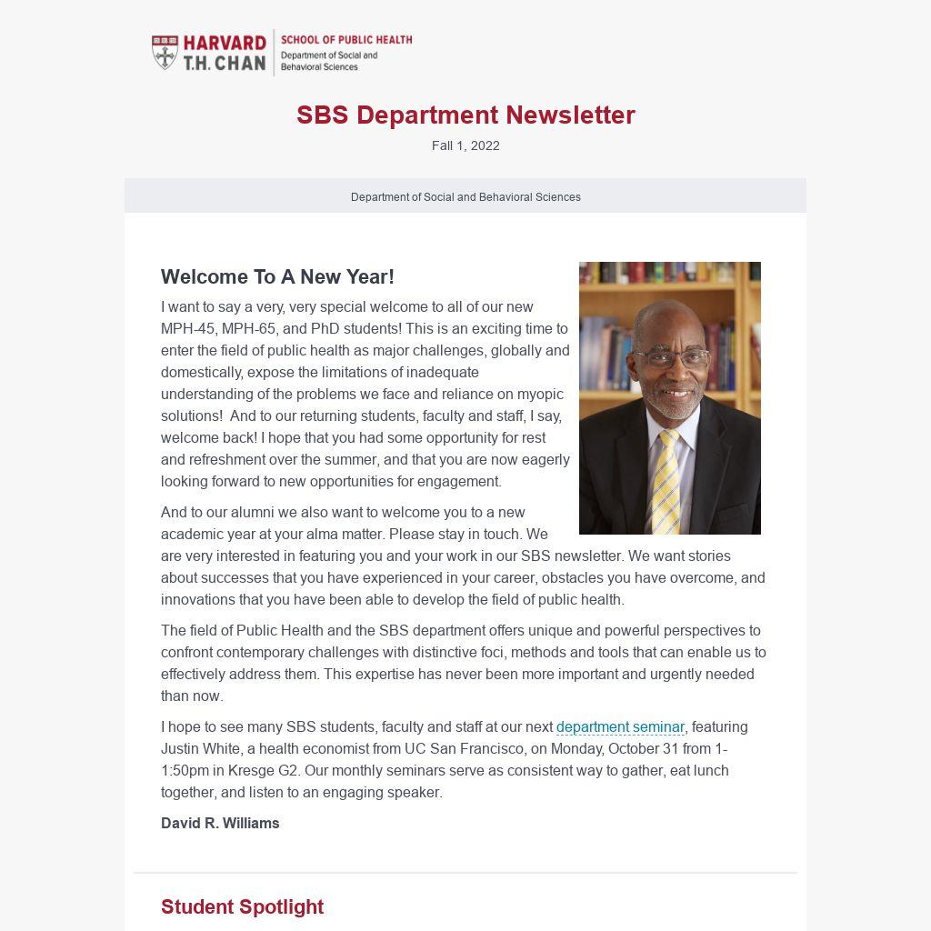 And to our alumni we also want to welcome you to a new academic year at your alma matter. Please stay in touch. We are very interested in featuring you and your work in our SBS newsletter. We want stories about successes that you have experienced in your career, obstacles you have overcome, and innovations that you have been able to develop the field of public health.