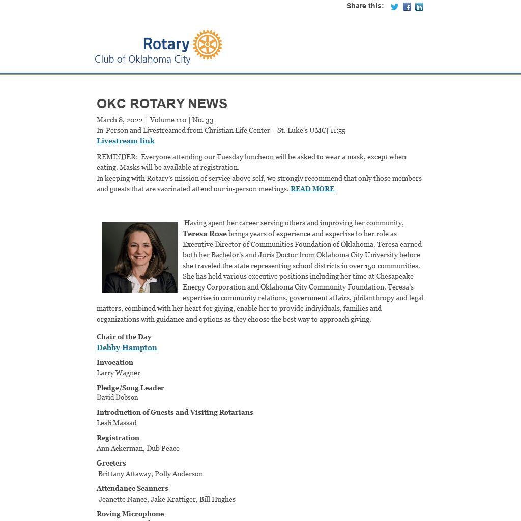 OKC Rotary NewsMarch 8, 2022 | Volume 110 | No. 33In-Person and Livestreamed from Christian Life Center - St. Luke's UMC| 11:55