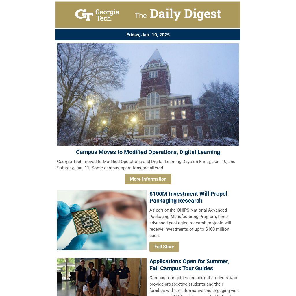 Georgia Tech moved to Modified Operations and Digital Learning Days on Friday, Jan. 10, and Saturday, Jan. 11. Some campus operations are altered.