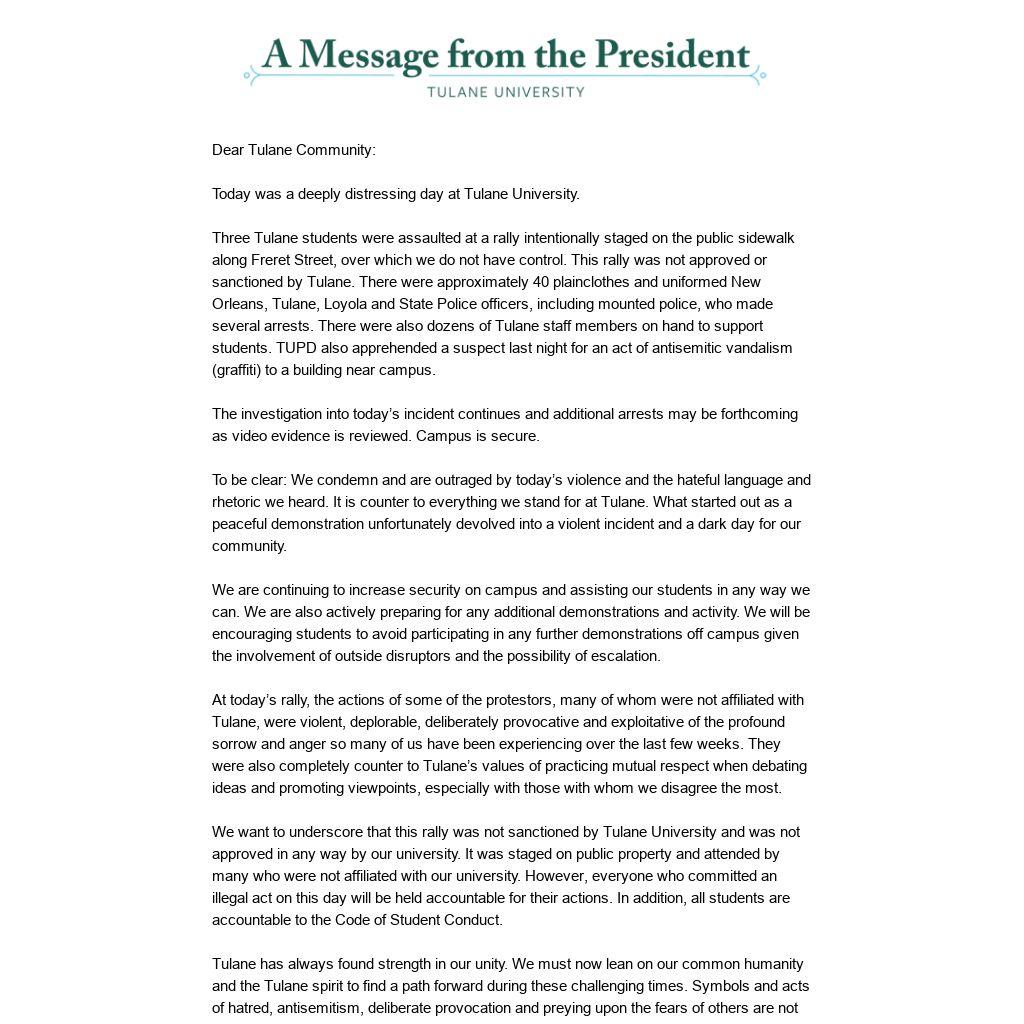 Three Tulane students were assaulted at a rally intentionally staged on the public sidewalk along Freret Street, over which we do not have control. This rally was not approved or sanctioned by Tulane. There were approximately 40 plainclothes and uniformed New Orleans, Tulane, Loyola and State Police officers, including mounted police, who made several arrests. There were also dozens of Tulane staff members on hand to support students. TUPD also apprehended a suspect last night for an act of antisemitic vandalism (graffiti) to a building near campus.