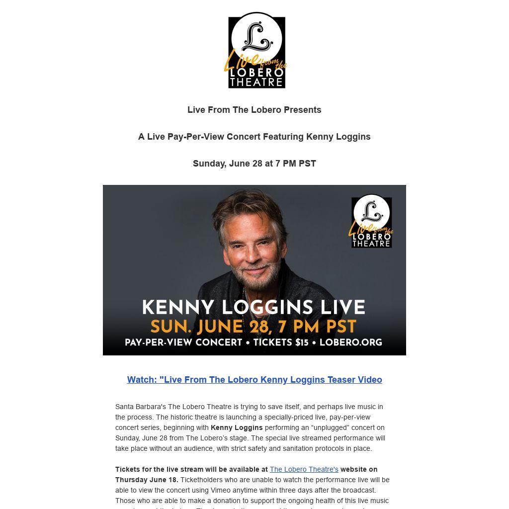 Santa Barbara's The Lobero Theatre is trying to save itself, and perhaps live music in the process. The historic theatre is launching a specially-priced live, pay-per-view concert series, beginning with Kenny Loggins performing an “unplugged” concert on Sunday, June 28 from The Lobero’s stage. The special live streamed performance will take place without an audience, with strict safety and sanitation protocols in place.