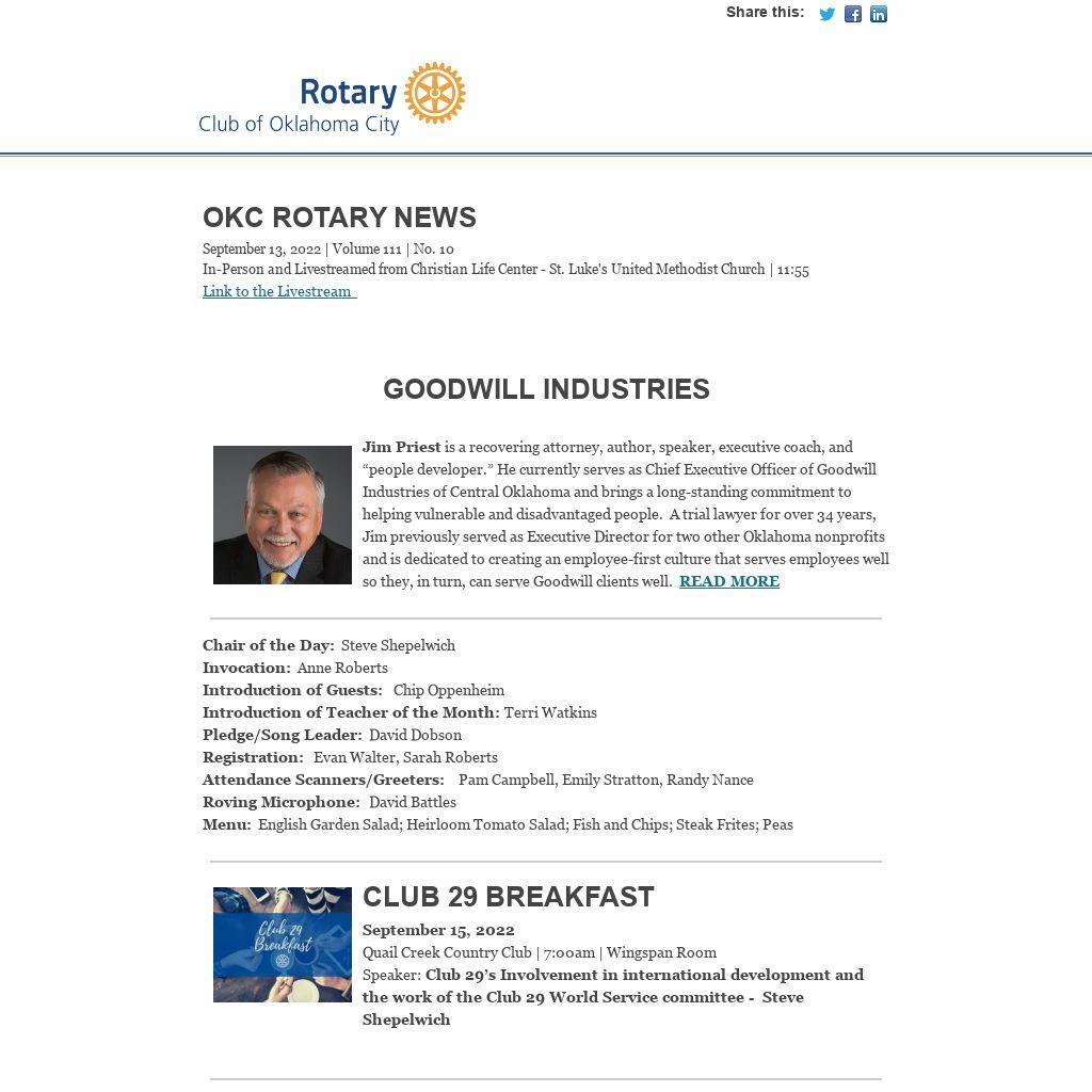 Rotary Club 29 has an online membership directory which contains current content information for all club members. The link to access the Club 29 directory can be found at the top of the home page of okcrotary.club or by clicking here. OKC Rotary has provided this tool as a convenience to help members stay in touch with one another. The online directory, just like the printed roster, should only be used for Rotary purposes. If you need help in accessing the directory, please email the office.