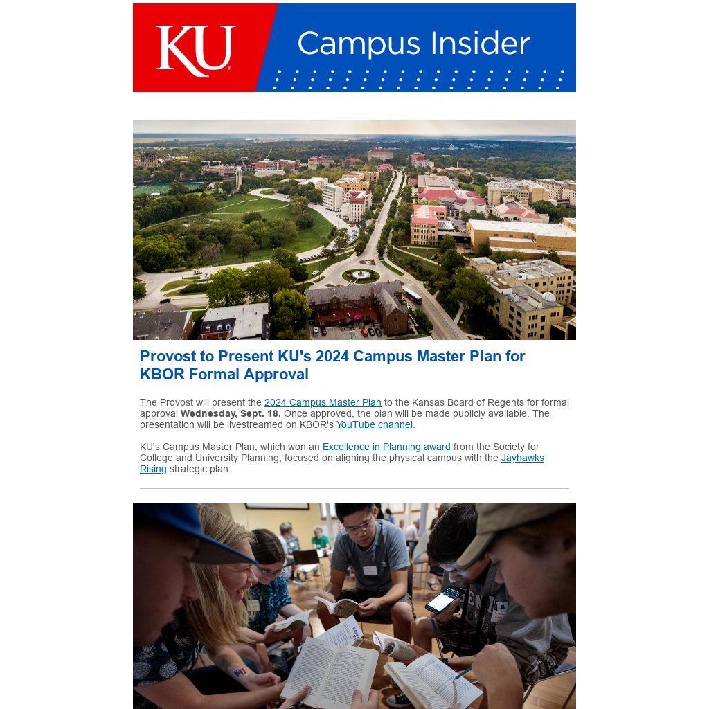 The Provost will present the 2024 Campus Master Plan to the Kansas Board of Regents for formal approval Wednesday, Sept. 18. Once approved, the plan will be made publicly available. The presentation will be livestreamed on KBOR's YouTube channel.
