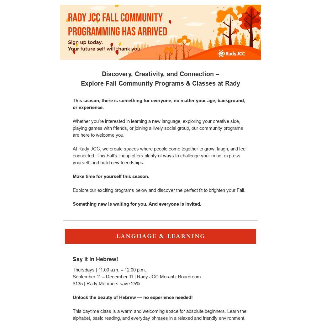 At Rady JCC, we create spaces where people come together to grow, laugh, and feel connected. This Fall's lineup offers plenty of ways to challenge your mind, express yourself, and build new friendships.
