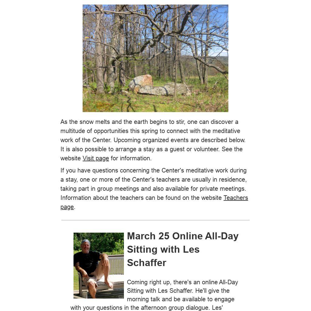 Wayne and Sandra worked closely with Toni Packer, the Center's founding teacher, for many years. She entrusted them with continuing the Center's meditative work. In addition to holding retreat, Wayne and Sandra take part in the Center's daily life, whether doing hands-on work or meeting with staff and guests. Their commitment to the Center and its work has been a mainstay over the decades.