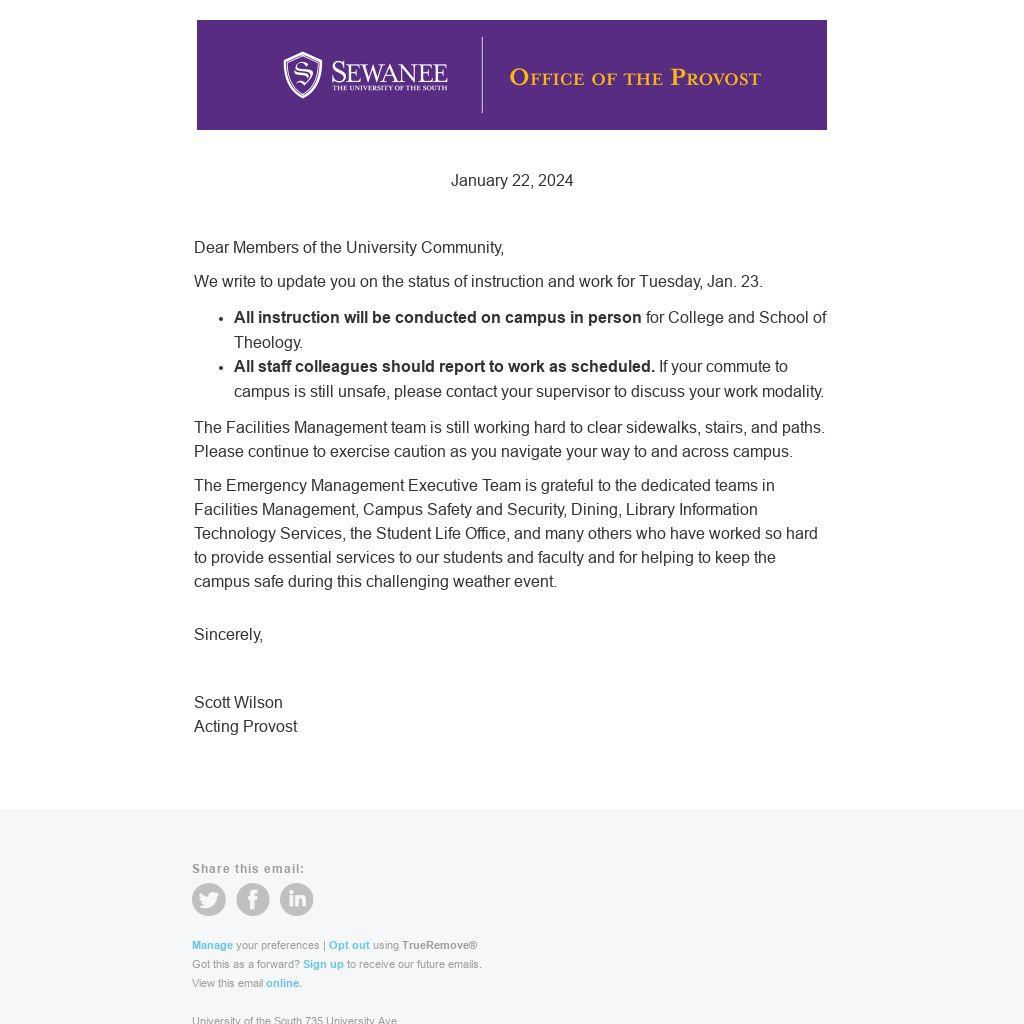 We write to update you on the status of instruction and work for Tuesday, Jan. 23.