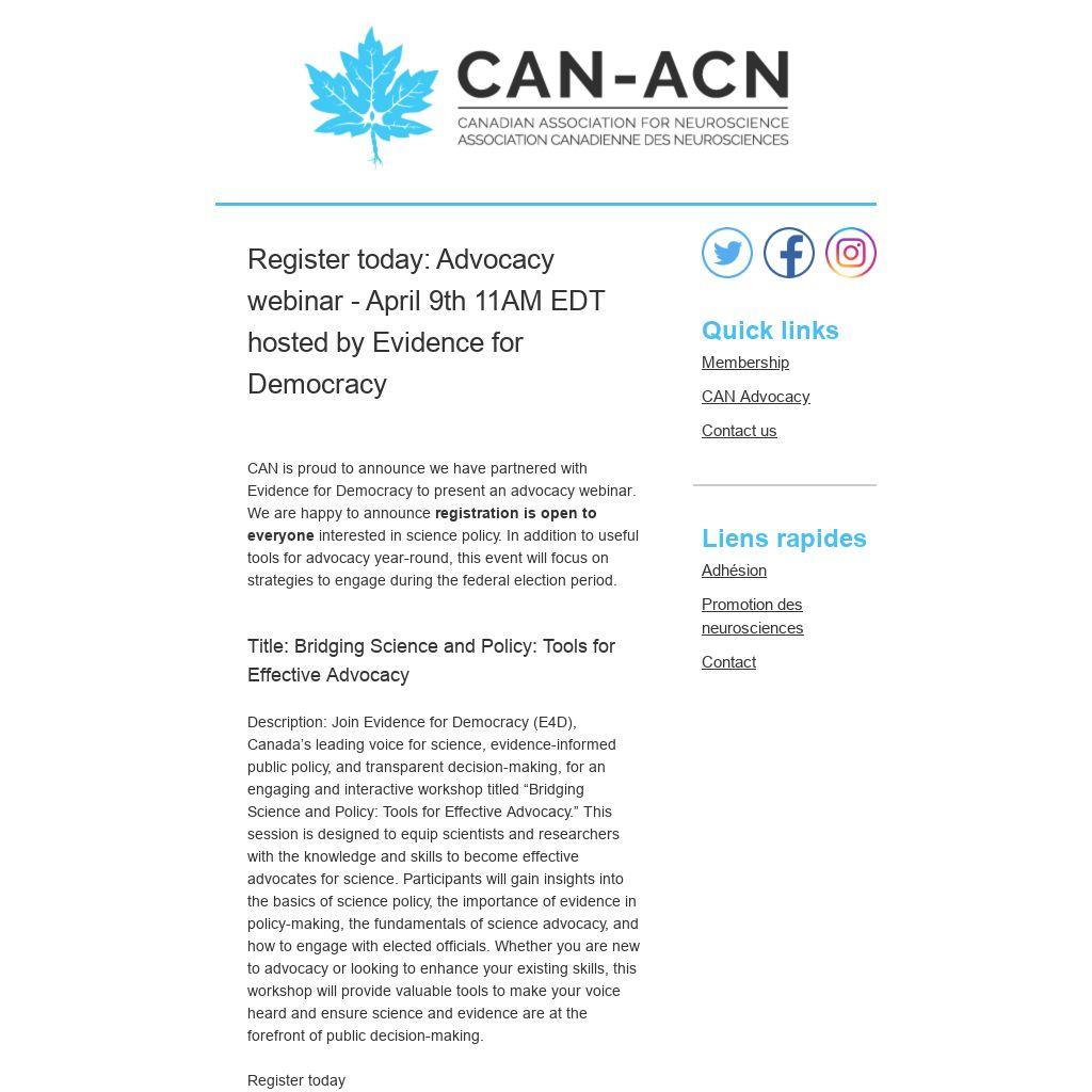 L’ACN est fière d’annoncer qu’elle s’est associés à Evidence for Democracy pour présenter un webinaire de plaidoyer. Cet événement est ouvert à toutes les personnes intéressées à la politique scientifique. En plus des outils utiles pour le plaidoyer tout au long de l’année, cet événement se concentrera sur les stratégies d’engagement pendant la période des élections fédérales.