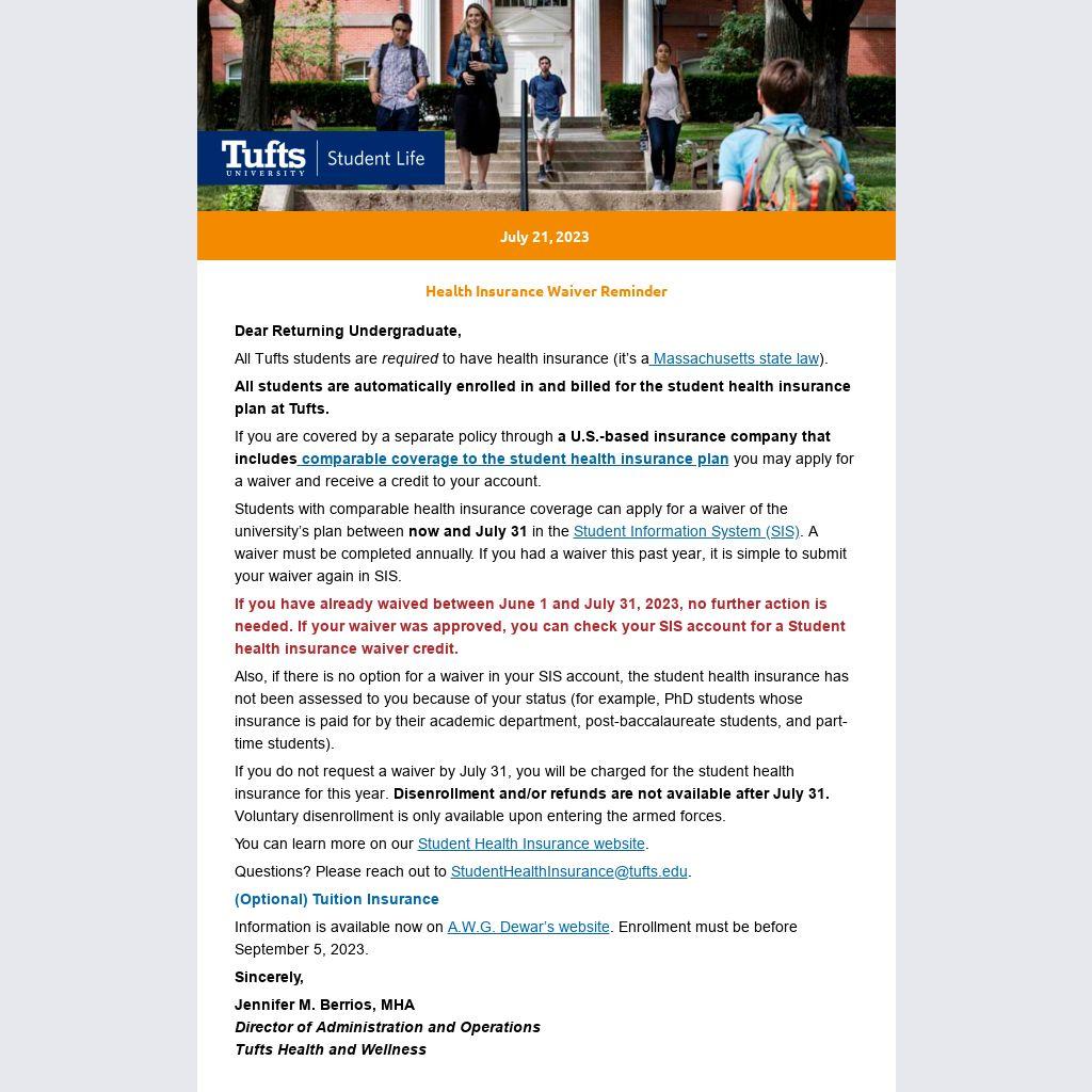 All students are automatically enrolled in and billed for the student health insurance plan at Tufts.