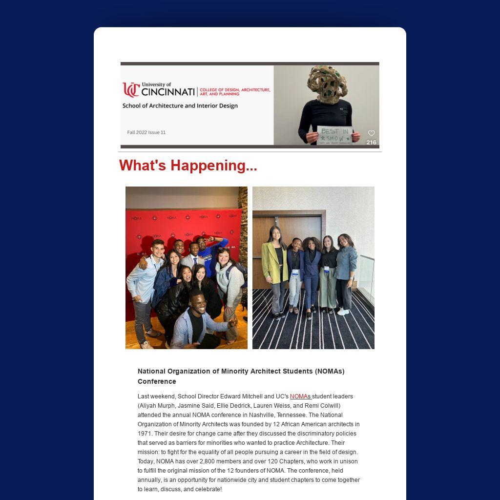 Last weekend, School Director Edward Mitchell and UC's NOMAs student leaders (Aliyah Murph, Jasmine Said, Ellie Dedrick, Lauren Weiss, and Remi Colwill) attended the annual NOMA conference in Nashville, Tennessee. The National Organization of Minority Architects was founded by 12 African American architects in 1971. Their desire for change came after they discussed the discriminatory policies that served as barriers for minorities who wanted to practice Architecture. Their mission: to fight for the equality of all people pursuing a career in the field of design. Today, NOMA has over 2,800 members and over 120 Chapters, who work in unison to fulfill the original mission of the 12 founders of NOMA. The conference, held annually, is an opportunity for nationwide city and student chapters to come together to learn, discuss, and celebrate!