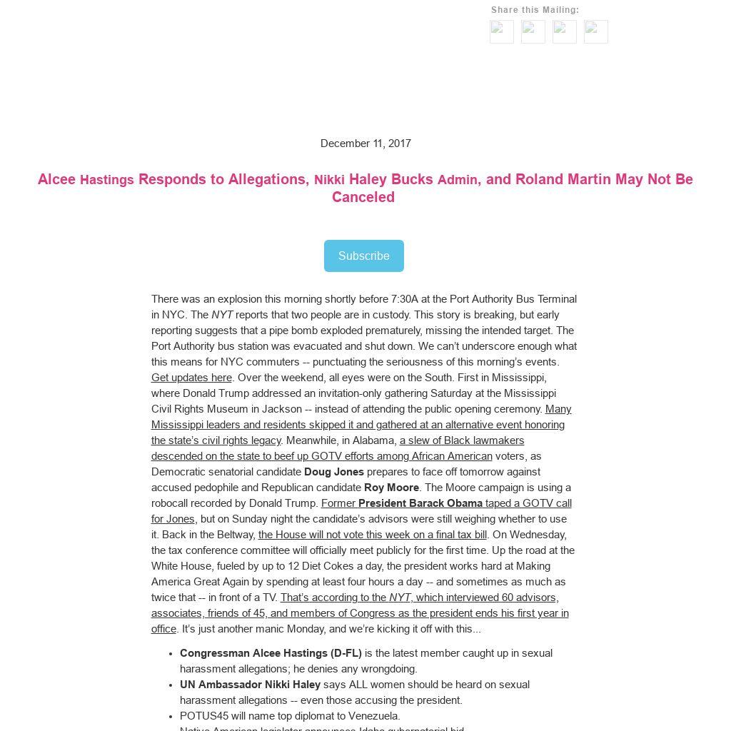 There was an explosion this morning shortly before 7:30A at the Port Authority Bus Terminal in NYC. The NYT reports that two people are in custody. This story is breaking, but early reporting suggests that a pipe bomb exploded prematurely, missing the intended target. The Port Authority bus station was evacuated and shut down. We can’t underscore enough what this means for NYC commuters -- punctuating the seriousness of this morning’s events. Get updates here. Over the weekend, all eyes were on the South. First in Mississippi, where Donald Trump addressed an invitation-only gathering Saturday at the Mississippi Civil Rights Museum in Jackson -- instead of attending the public opening ceremony. Many Mississippi leaders and residents skipped it and gathered at an alternative event honoring the state’s civil rights legacy. Meanwhile, in Alabama, a slew of Black lawmakers descended on the state to beef up GOTV efforts among African American voters, as Democratic senatorial candidate Doug Jones prepares to face off tomorrow against accused pedophile and Republican candidate Roy Moore. The Moore campaign is using a robocall recorded by Donald Trump. Former President Barack Obama taped a GOTV call for Jones, but on Sunday night the candidate’s advisors were still weighing whether to use it. Back in the Beltway, the House will not vote this week on a final tax bill. On Wednesday, the tax conference committee will officially meet publicly for the first time. Up the road at the White House, fueled by up to 12 Diet Cokes a day, the president works hard at Making America Great Again by spending at least four hours a day -- and sometimes as much as twice that -- in front of a TV. That’s according to the NYT, which interviewed 60 advisors, associates, friends of 45, and members of Congress as the president ends his first year in office. It’s just another manic Monday, and we’re kicking it off with this...