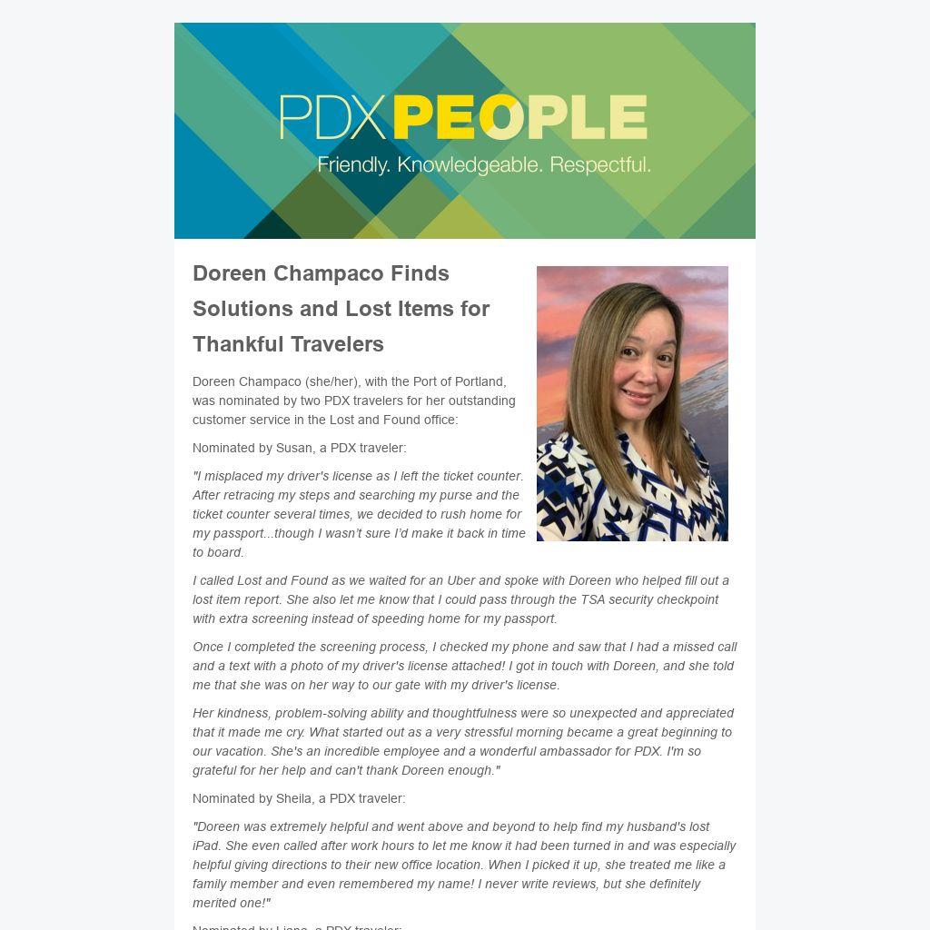 Doreen Champaco (she/her), with the Port of Portland, was nominated by two PDX travelers for her outstanding customer service in the Lost and Found office: