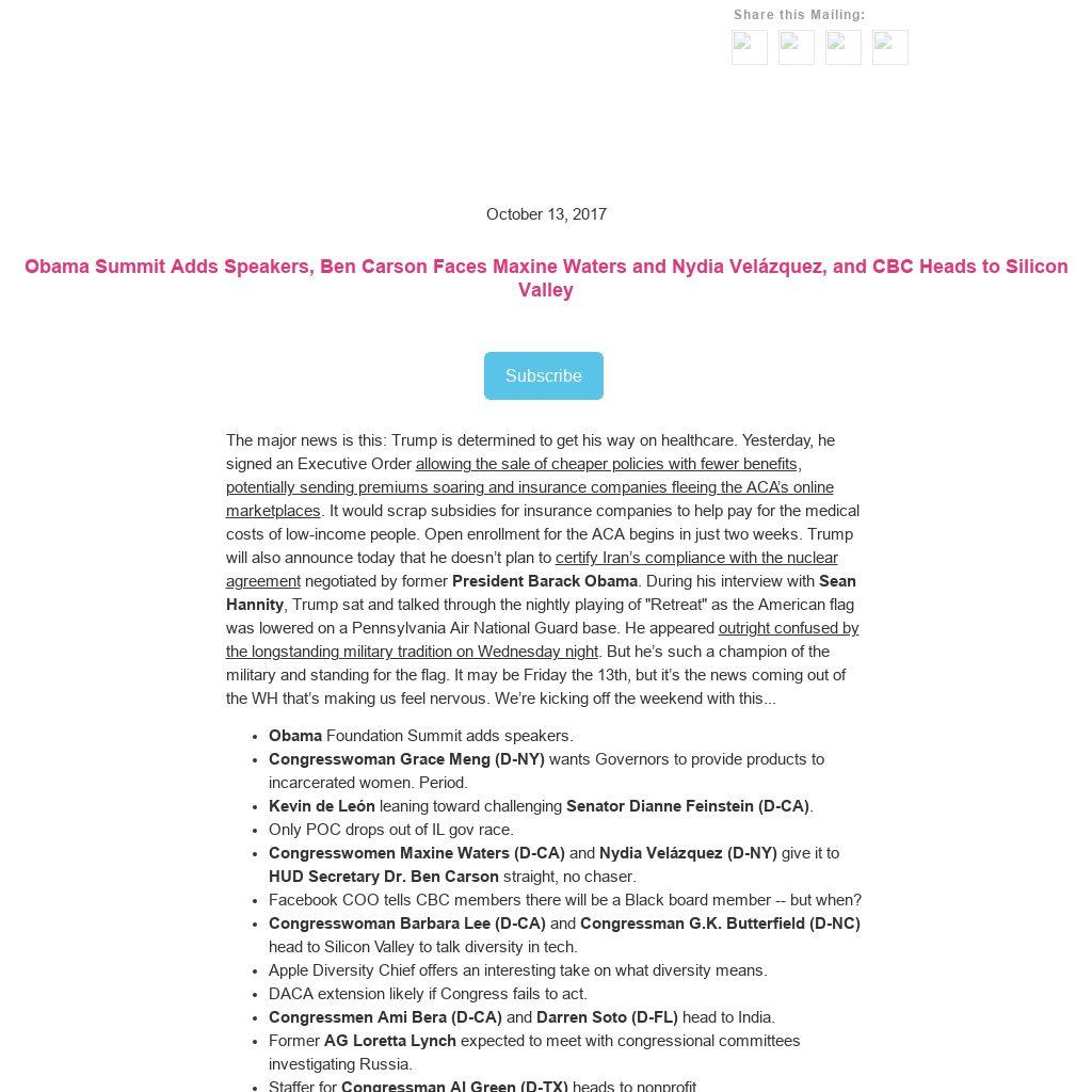 Obama Summit Adds Speakers, Ben Carson Faces Maxine Waters and Nydia Velázquez, and CBC Heads to Silicon Valley