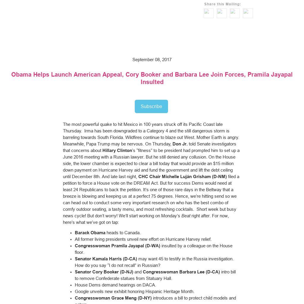 The most powerful quake to hit Mexico in 100 years struck off its Pacific Coast late Thursday. Irma has been downgraded to a Category 4 and the still dangerous storm is barreling towards South Florida. Wildfires continue to blaze out West. Mother Earth is angry. Meanwhile, Papa Trump may be nervous. On Thursday, Don Jr. told Senate investigators that concerns about Hillary Clinton’s “fitness” to be president had prompted him to set up a June 2016 meeting with a Russian lawyer. But he still denied any collusion. On the House side, the lower chamber is expected to clear a bill today that would provide an $15 million down payment on Hurricane Harvey aid and fund the government and lift the debt ceiling until December 8th. And late last night, CHC Chair Michelle Luján Grisham (D-NM) filed a petition to force a House vote on the DREAM Act. But for success Dems would need at least 24 Republicans to back the petition. It’s one of those rare days in the Beltway that a breeze is blowing and keeping us at a perfect 75 degrees. Hence, we’re hitting send so we can head out to conduct some very important research on who has the best combo of comfy outdoor seating, a tasty menu, and most refreshing cocktails. Short week but busy news cycle! But don’t worry! We’ll start working on Monday’s Beat right after. For now, here’s what we’ve got on tap: