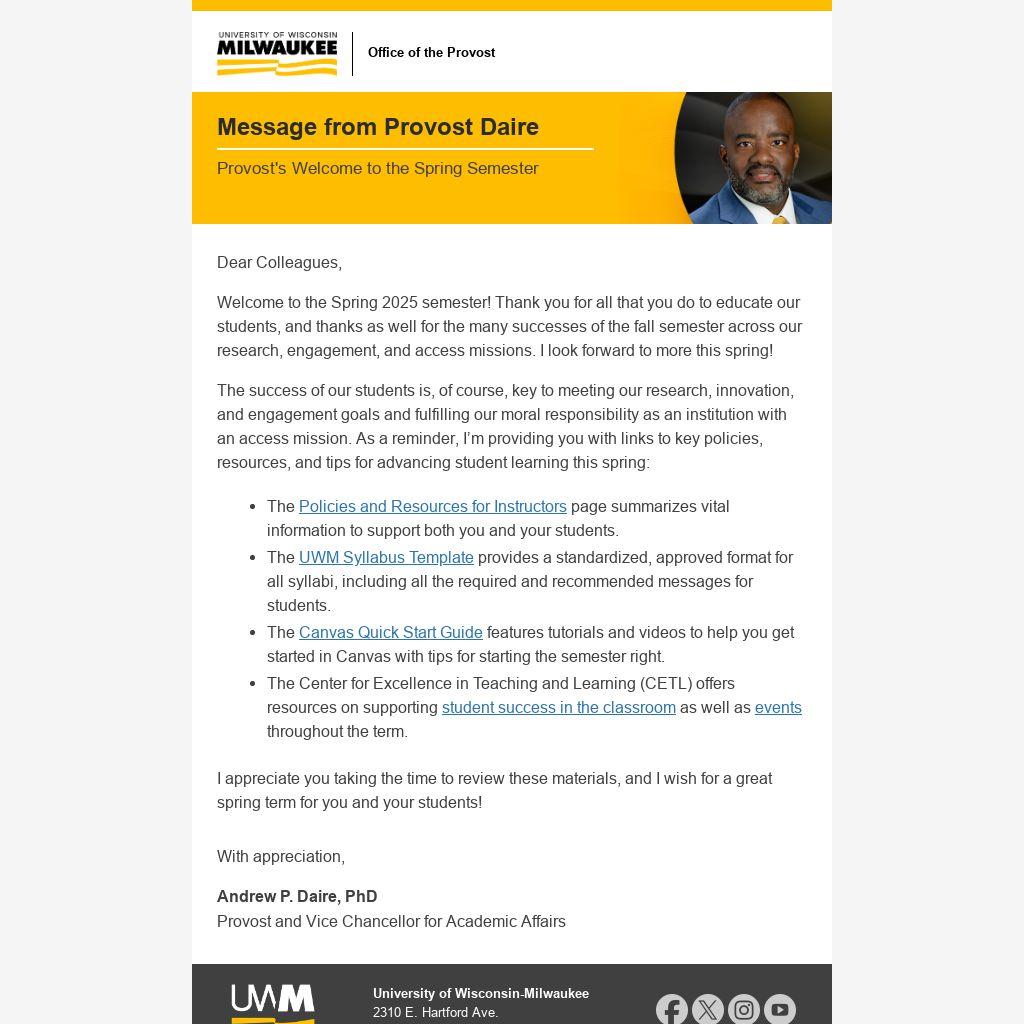 Welcome to the Spring 2025 semester! Thank you for all that you do to educate our students, and thanks as well for the many successes of the fall semester across our research, engagement, and access missions. I look forward to more this spring!