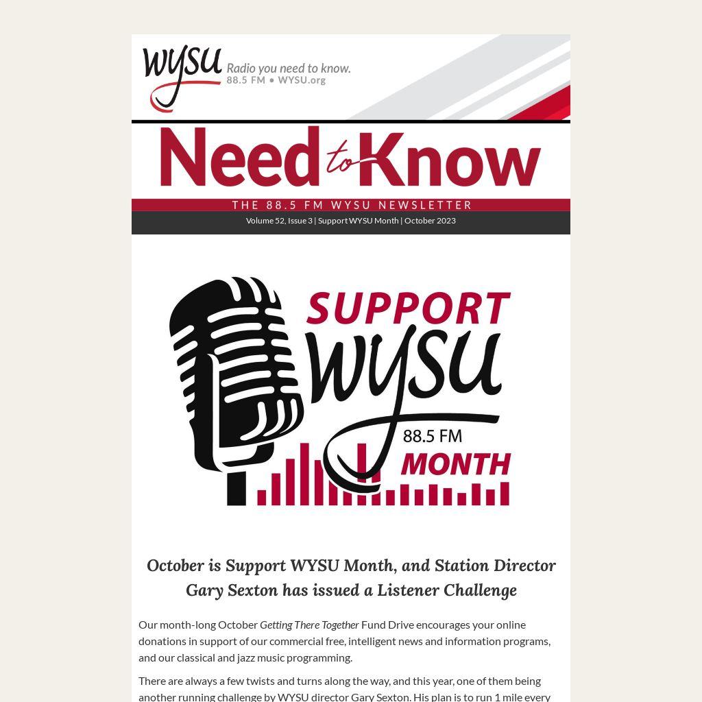 There are always a few twists and turns along the way, and this year, one of them being another running challenge by WYSU director Gary Sexton. His plan is to run 1 mile every weekday hour from 8 am to 5 pm during Support WYSU Month in October. That is 1 mile each hour for 9 hours over 22 weekdays, for a total of 198 miles + 2 extra to get to 200 miles!