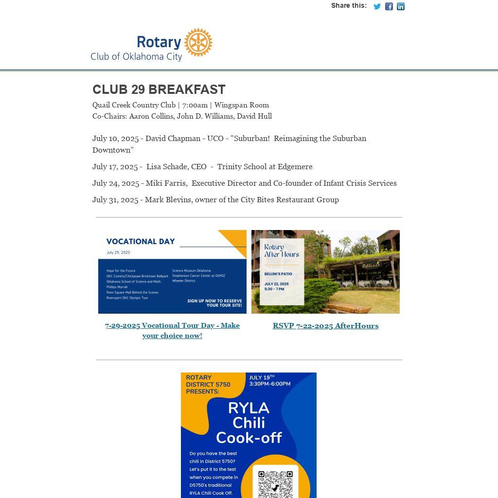 Club 29 Rotarians may watch the program video as an attendance makeup- 2 per quarter.  The form to submit your video makeup is located underneath each video in the description section, in the "Members" section of okcrotary.club or  you may access it here.
