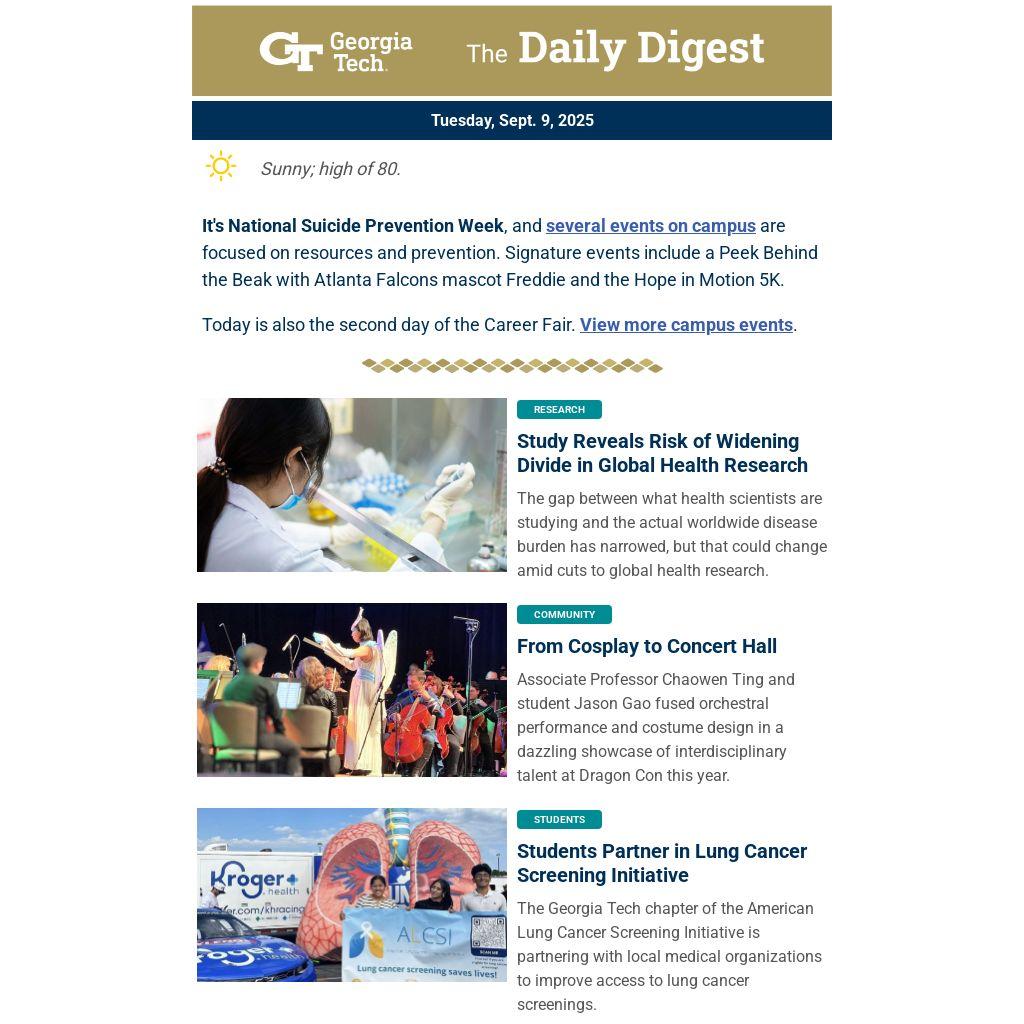 It's National Suicide Prevention Week, and several events on campus are focused on resources and prevention. Signature events include a Peek Behind the Beak with Atlanta Falcons mascot Freddie and the Hope in Motion 5K.
