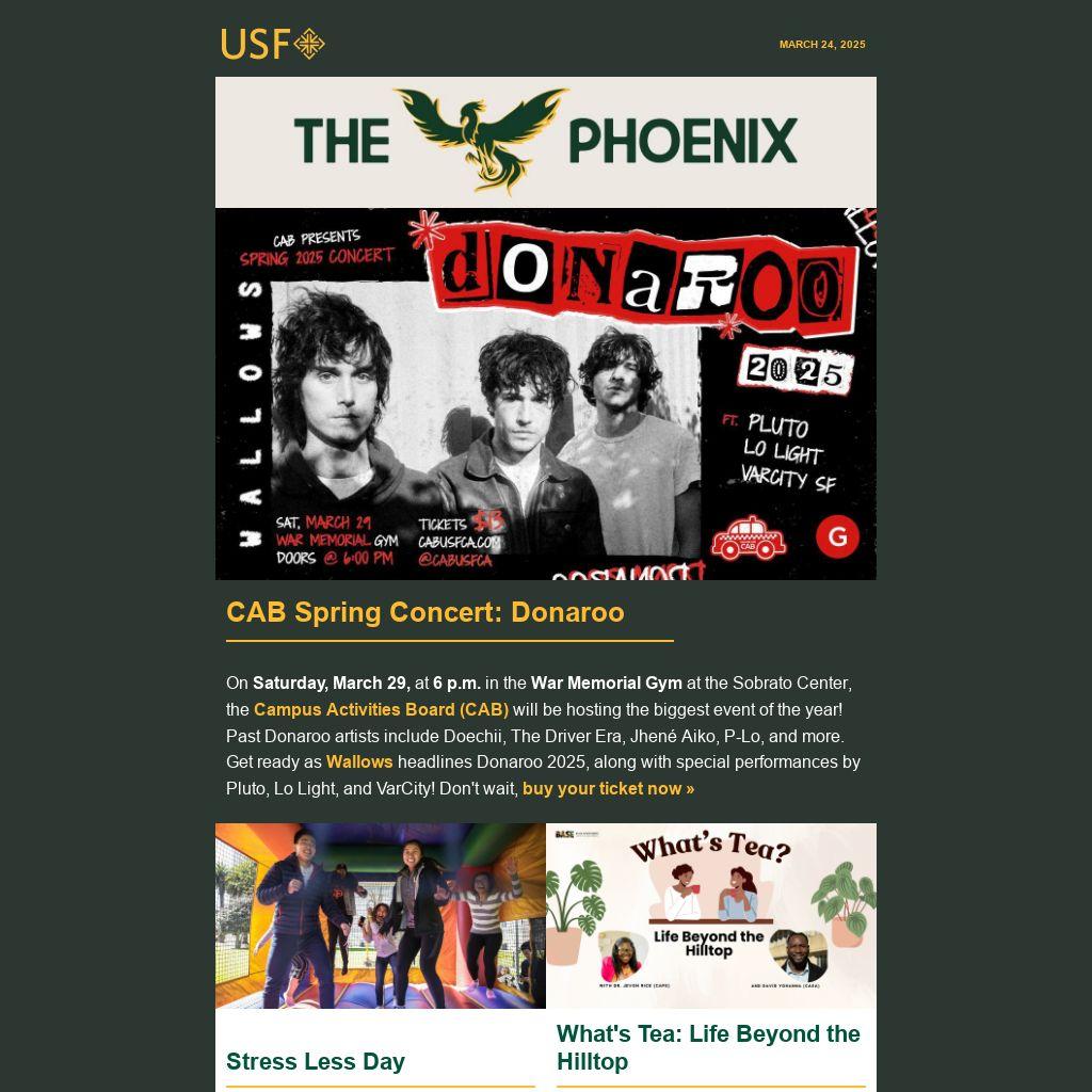 On Saturday, March 29, at 6 p.m. in the War Memorial Gym at the Sobrato Center, the Campus Activities Board (CAB) will be hosting the biggest event of the year! Past Donaroo artists include Doechii, The Driver Era, Jhené Aiko, P-Lo, and more. Get ready as Wallows headlines Donaroo 2025, along with special performances by Pluto, Lo Light, and VarCity! Don't wait, buy your ticket now »