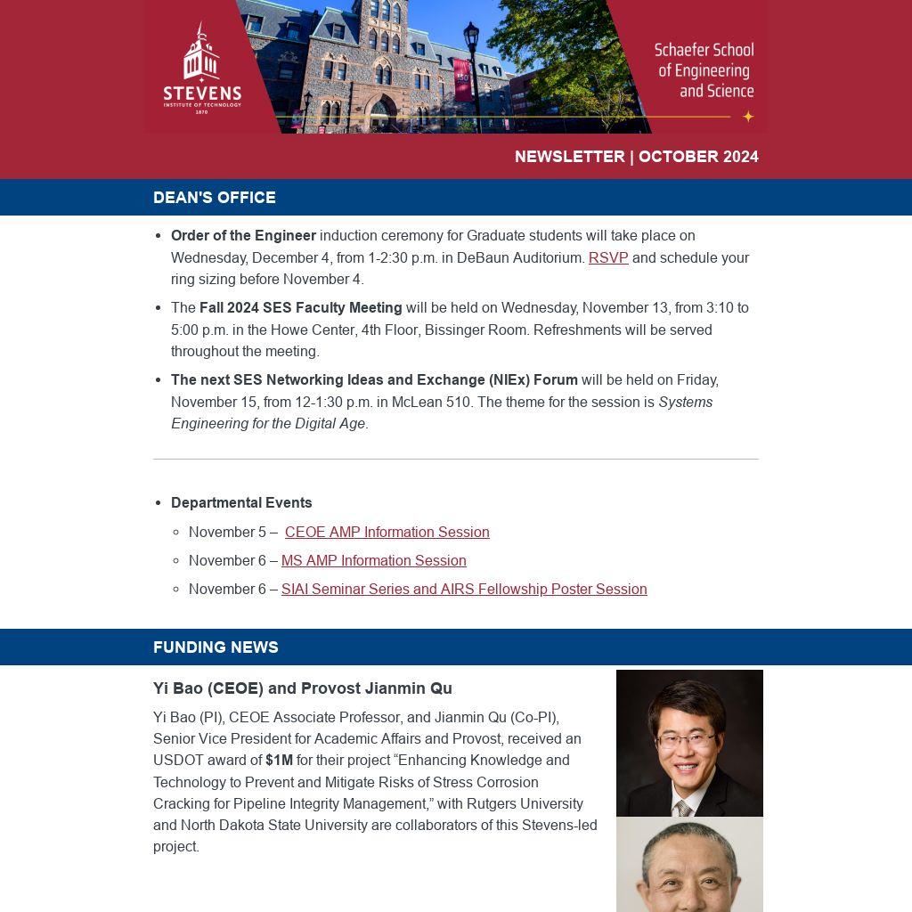 Yi Bao (PI), CEOE Associate Professor, and Jianmin Qu (Co-PI), Senior Vice President for Academic Affairs and Provost, received an USDOT award of $1M for their project “Enhancing Knowledge and Technology to Prevent and Mitigate Risks of Stress Corrosion Cracking for Pipeline Integrity Management,” with Rutgers University and North Dakota State University are collaborators of this Stevens-led project.