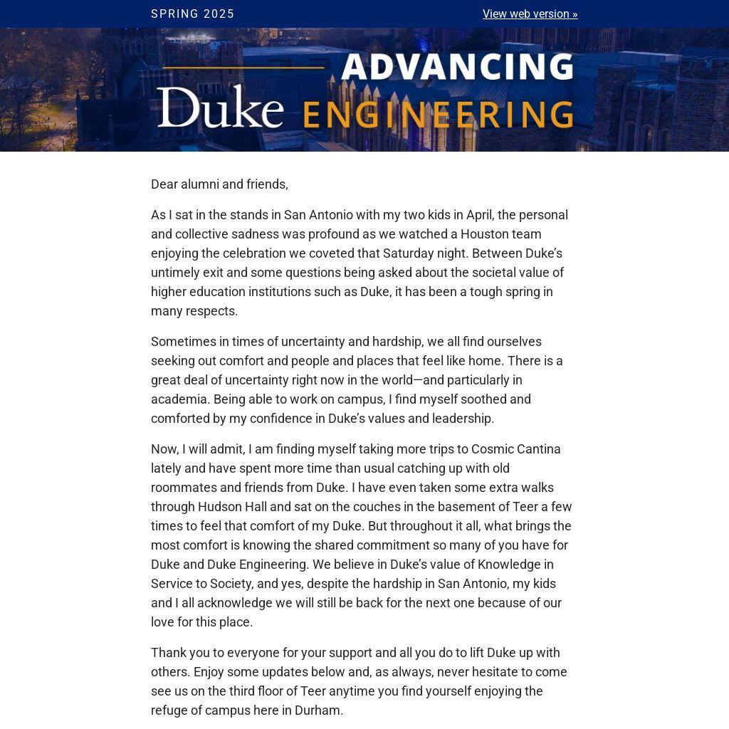 Now, I will admit, I am finding myself taking more trips to Cosmic Cantina lately and have spent more time than usual catching up with old roommates and friends from Duke. I have even taken some extra walks through Hudson Hall and sat on the couches in the basement of Teer a few times to feel that comfort of my Duke. But throughout it all, what brings the most comfort is knowing the shared commitment so many of you have for Duke and Duke Engineering. We believe in Duke’s value of Knowledge in Service to Society, and yes, despite the hardship in San Antonio, my kids and I all acknowledge we will still be back for the next one because of our love for this place.