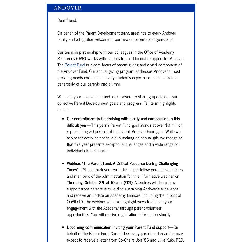- Webinar: “The Parent Fund: A Critical Resource During Challenging Times”—Please mark your calendar to join fellow parents, volunteers, and members of the administration for this informative webinar on Thursday, October 29, at 10 a.m. (EDT). Attendees will learn how support from parents is crucial to sustaining Andover’s excellence and receive an update on Academy finances, including the impact of COVID-19. The webinar will also highlight ways to deepen your engagement with the Academy through parent volunteer opportunities. You will receive registration information shortly.