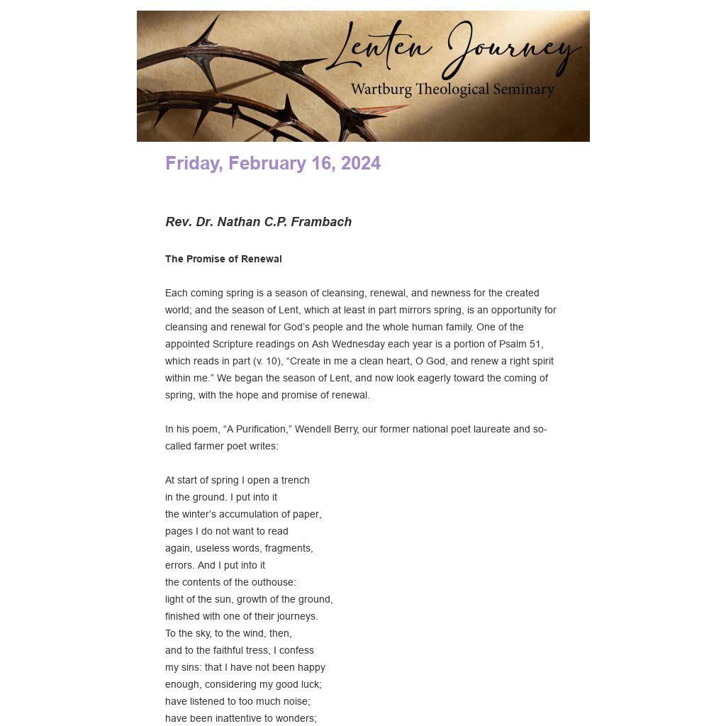 Each coming spring is a season of cleansing, renewal, and newness for the created world; and the season of Lent, which at least in part mirrors spring, is an opportunity for cleansing and renewal for God’s people and the whole human family. One of the appointed Scripture readings on Ash Wednesday each year is a portion of Psalm 51, which reads in part (v. 10), “Create in me a clean heart, O God, and renew a right spirit within me.” We began the season of Lent, and now look eagerly toward the coming of spring, with the hope and promise of renewal.