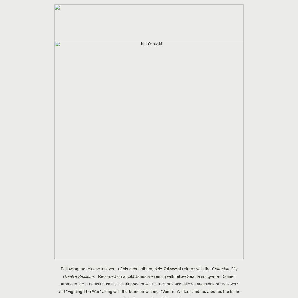Following the release last year of his debut album, Kris Orlowski returns with the Columbia City Theatre Sessions. Recorded on a cold January evening with fellow Seattle songwriter Damien Jurado in the production chair, this stripped down EP includes acoustic reimaginings of "Believer" and "Fighting The War" along with the brand new song, "Winter, Winter," and, as a bonus track, the original album version of "Believer".