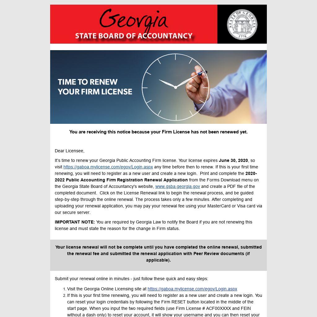 If you choose not to renew online and would like to submit a paper renewal application, please print the 2020-2022 Public Accounting Firm Registration Renewal Application from the Forms Download menu on the Georgia State Board of Accountancy's website, www.gsba.georgia.gov and submit to the Board office. Make sure to include your Firm license number on all correspondence to the Board office. Please note that renewing by mail may take up to 4 weeks to process after the completed renewal application is received. A late fee will be imposed if you renew after the license expiration date. You cannot practice after your license expiration date.