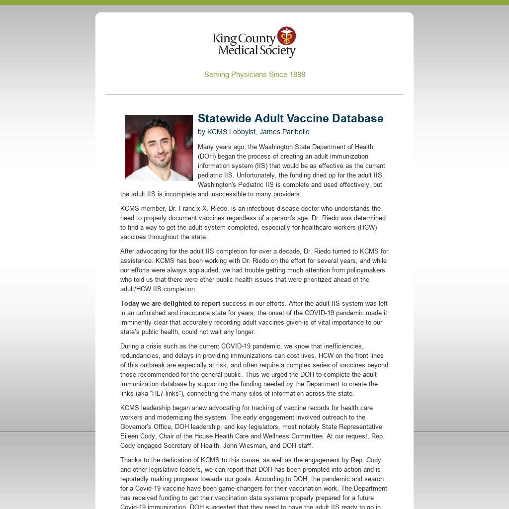 Thanks to the dedication of KCMS to this cause, as well as the engagement by Rep. Cody and other legislative leaders, we can report that DOH has been prompted into action and is reportedly making progress towards our goals. According to DOH, the pandemic and search for a Covid-19 vaccine have been game-changers for their vaccination work. The Department has received funding to get their vaccination data systems properly prepared for a future Covid-19 immunization. DOH suggested that they need to have the adult IIS ready to go in the next three months... READ THE FULL MESSAGE BY CLICKING BELOW