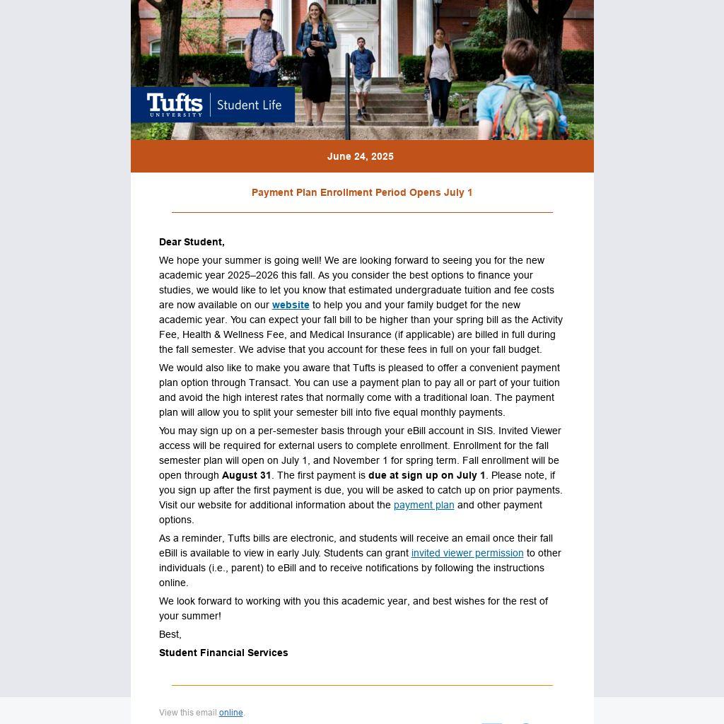 We would also like to make you aware that Tufts is pleased to offer a convenient payment plan option through Transact. You can use a payment plan to pay all or part of your tuition and avoid the high interest rates that normally come with a traditional loan. The payment plan will allow you to split your semester bill into five equal monthly payments.