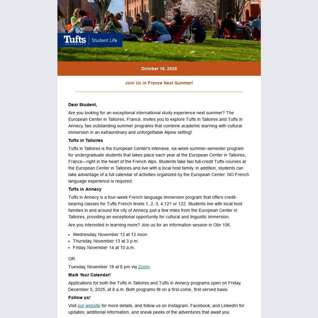 Are you looking for an exceptional international study experience next summer? The European Center in Talloires, France, invites you to explore Tufts in Talloires and Tufts in Annecy, two outstanding summer programs that combine academic learning with cultural immersion in an extraordinary and unforgettable Alpine setting!