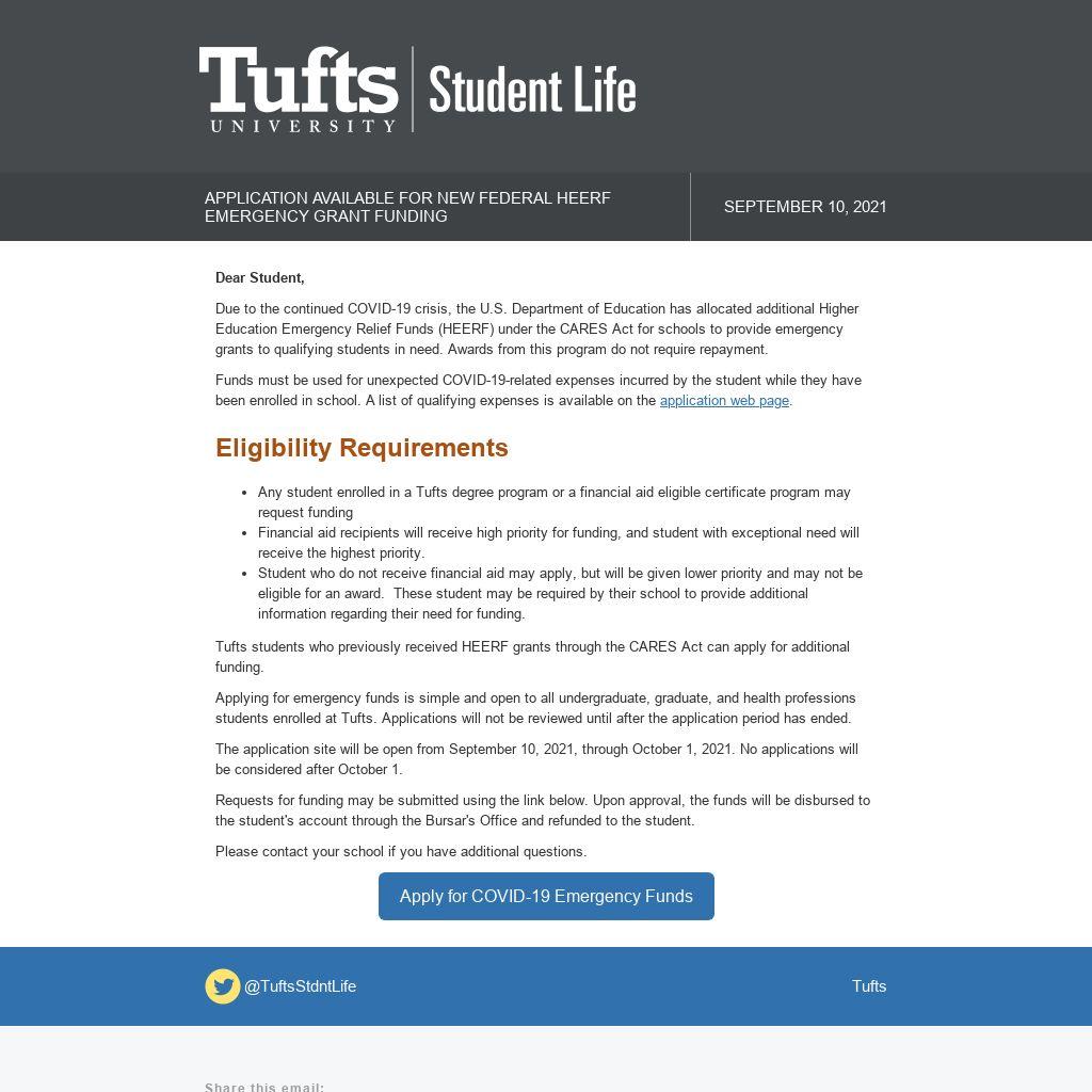 Tufts students who previously received HEERF grants through the CARES Act can apply for additional funding.