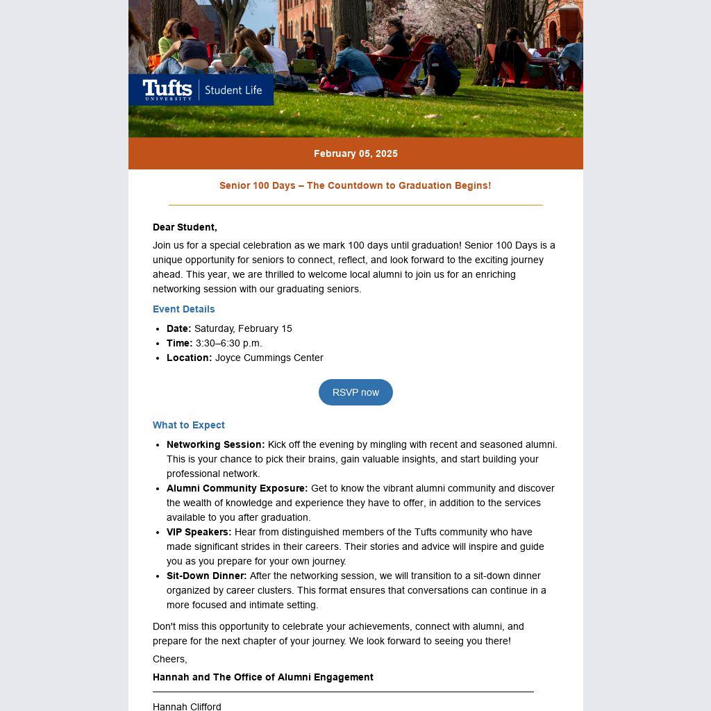 VIP Speakers: Hear from distinguished members of the Tufts community who have made significant strides in their careers. Their stories and advice will inspire and guide you as you prepare for your own journey.