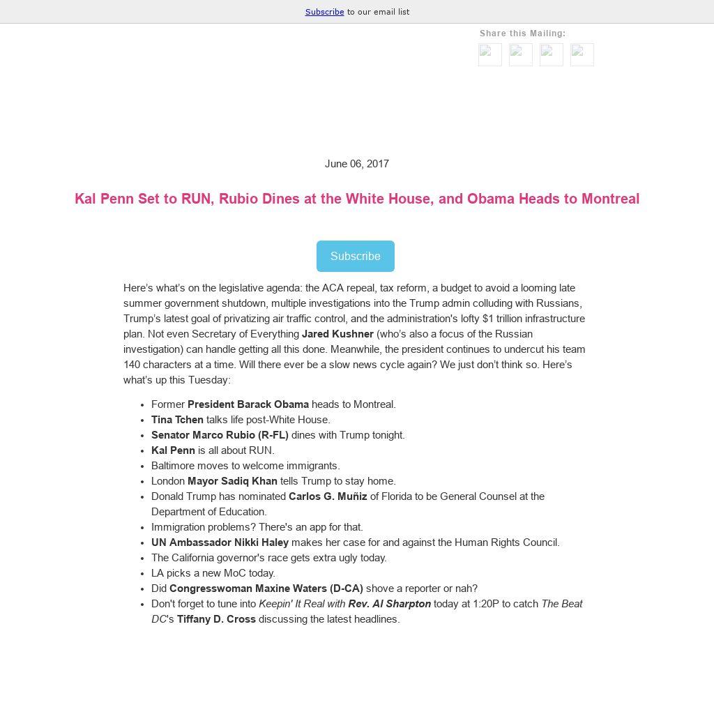 | Here’s what’s on the legislative agenda: the ACA repeal, tax reform, a budget to avoid a looming late summer government shutdown, multiple investigations into the Trump admin colluding with Russians, Trump’s latest goal of privatizing air traffic control, and the administration's lofty $1 trillion infrastructure plan. Not even Secretary of Everything Jared Kushner (who’s also a focus of the Russian investigation) can handle getting all this done. Meanwhile, the president continues to undercut his team 140 characters at a time. Will there ever be a slow news cycle again? We just don’t think so. Here’s what’s up this Tuesday: