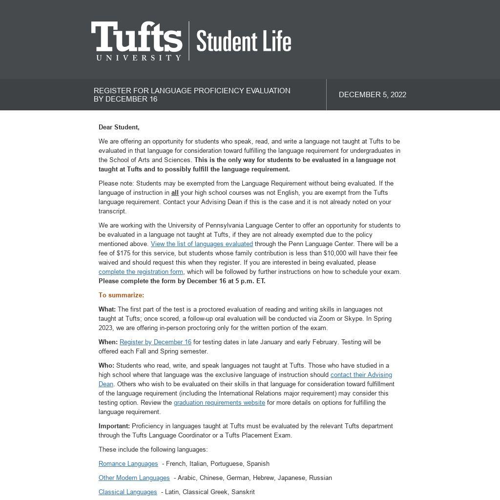 We are offering an opportunity for students who speak, read, and write a language not taught at Tufts to be evaluated in that language for consideration toward fulfilling the language requirement for undergraduates in the School of Arts and Sciences. This is the only way for students to be evaluated in a language not taught at Tufts and to possibly fulfill the language requirement.