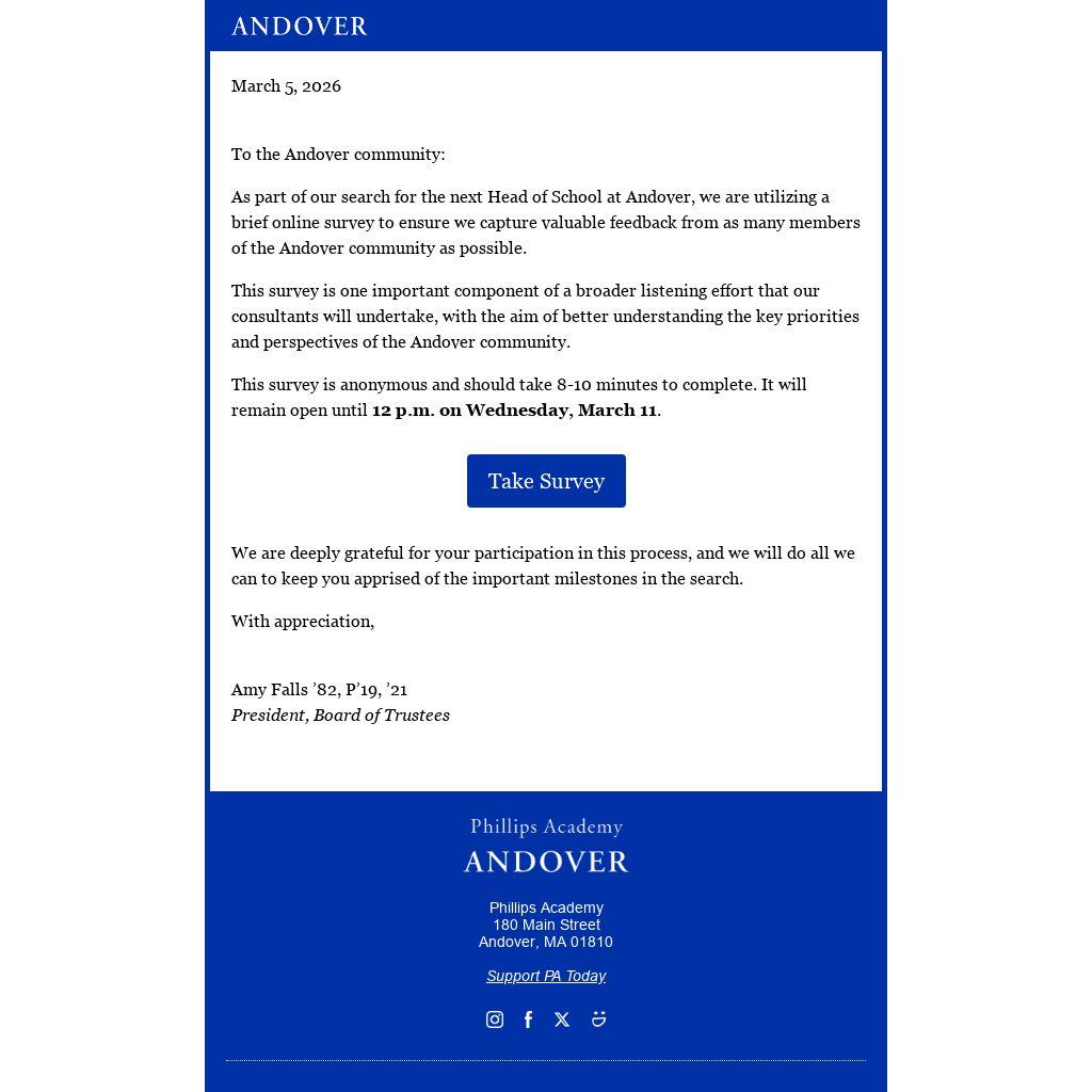 As part of our search for the next Head of School at Andover, we are utilizing a brief online survey to ensure we capture valuable feedback from as many members of the Andover community as possible.