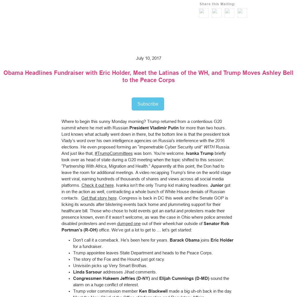 Where to begin this sunny Monday morning? Trump returned from a contentious G20 summit where he met with Russian President Vladimir Putin for more than two hours. Lord knows what actually went down in there, but the bottom line is that the president took Vlady’s word over his own intelligence agencies on Russia's interference with the 2016 elections. He even proposed forming an “impenetrable Cyber Security unit” WITH Russia. And just like that, #TrumpCommittees was born. You’re welcome. Ivanka Trump briefly took over as head of state during a G20 meeting when the topic shifted to this session: “Partnership With Africa, Migration and Health.” Apparently at this point, the Don had to leave the room for additional meetings. A video recapping Trump’s time on the world stage went viral, earning hundreds of thousands of shares and views across all social media platforms. Check it out here. Ivanka isn’t the only Trump kid making headlines. Junior got in on the action as well, contradicting a whole bunch of White House denials of Russian contacts. Get that story here. Congress is back in DC this week and the Senate GOP is licking its wounds after blistering events back home and plummeting support for their healthcare bill. Those who chose to hold events got an earful and protesters made their presence known, even if it wasn’t welcome, as was the case in Ohio where police arrested disabled protesters and even dumped one out of their wheelchair outside of Senator Rob Portman’s (R-OH) office. We’ve got a lot to get to … let’s get started:- Don’t call it a comeback. He’s been here for years. Barack Obama joins Eric Holder for a fundraiser.