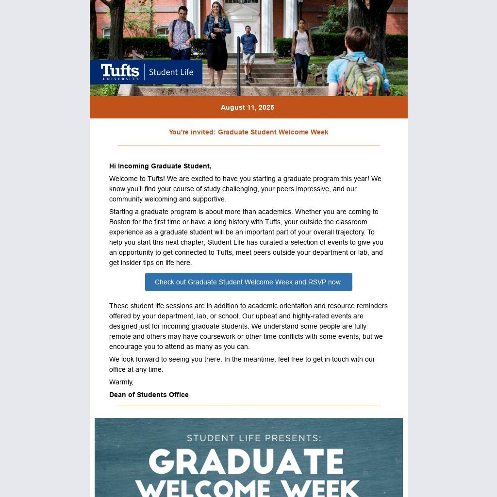 Welcome to Tufts! We are excited to have you starting a graduate program this year! We know you’ll find your course of study challenging, your peers impressive, and our community welcoming and supportive.