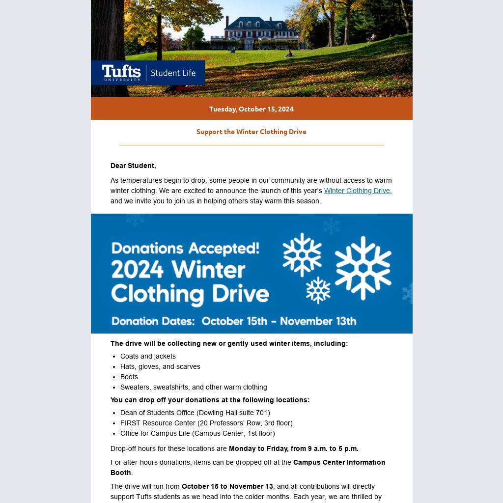 The drive will run from October 15 to November 13, and all contributions will directly support Tufts students as we head into the colder months. Each year, we are thrilled by the generosity and community spirit that are evident in the donations received. We invite you to be part of this important Tufts tradition. Together, we can make a meaningful impact by helping ensure everyone stays warm this winter.