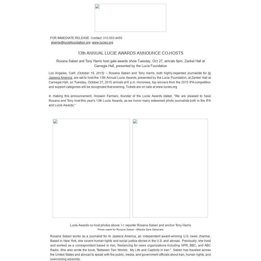 Lucie Awards co-host photos above: l-r: reporter Roxana Saberi and anchor Tony Harris