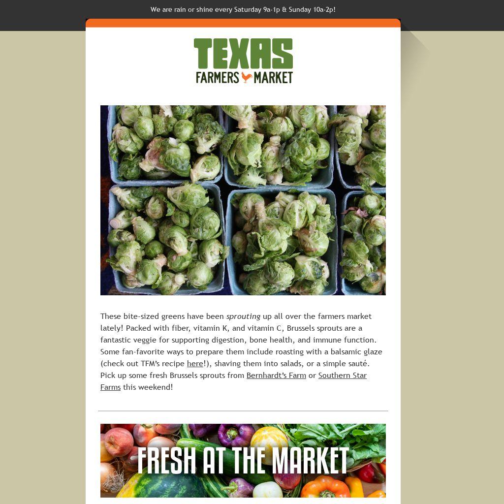 These bite-sized greens have been sprouting up all over the farmers market lately! Packed with fiber, vitamin K, and vitamin C, Brussels sprouts are a fantastic veggie for supporting digestion, bone health, and immune function. Some fan-favorite ways to prepare them include roasting with a balsamic glaze (check out TFMâs recipe here!), shaving them into salads, or a simple sautĂŠ. Pick up some fresh Brussels sprouts from Bernhardtâs Farm or Southern Star Farms this weekend!
