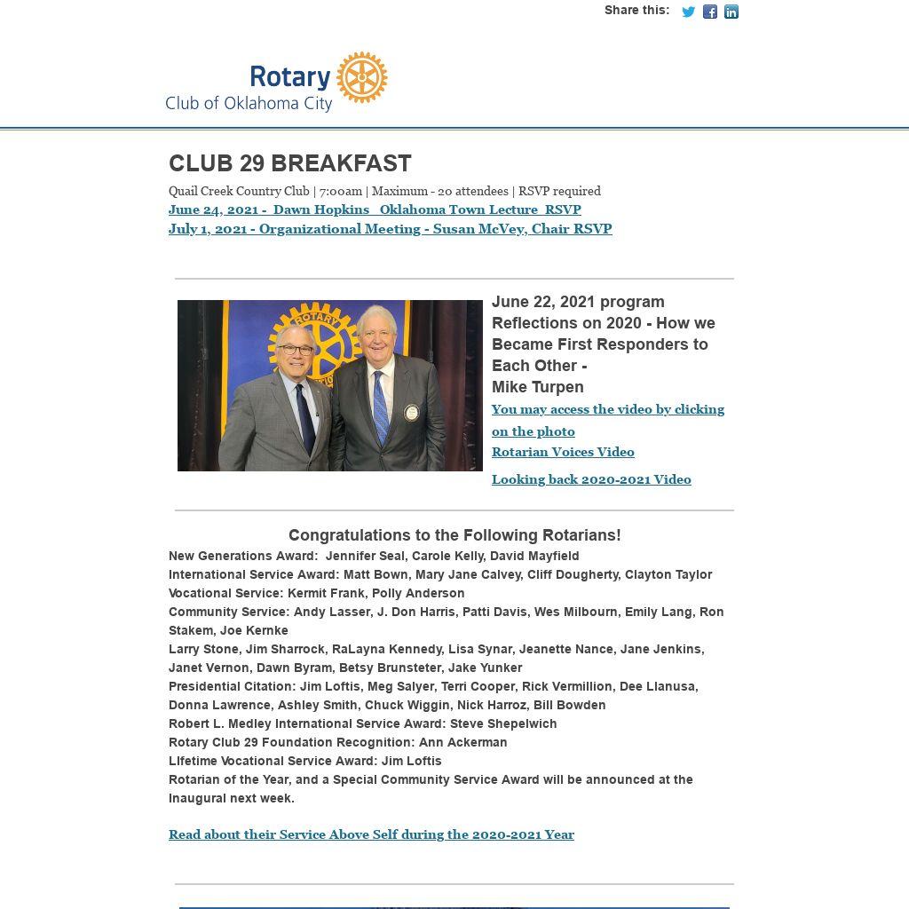 Rotary Club 29 has an online membership directory which contains current content information for all club members. The link to access the Club 29 directory can be found at the top of the home page of okcrotary.com or by clicking here.
