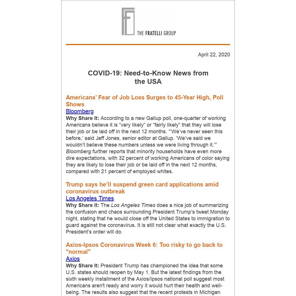 Why Share It: According to a new Gallup poll, one-quarter of working Americans believe it is “very likely” or “fairly likely” that they will lose their job or be laid off in the next 12 months. “‘We’ve never seen this before,’ said Jeff Jones, senior editor at Gallup. ‘We’ve said we wouldn’t believe these numbers unless we were living through it.’” Bloomberg further reports that minority households have even more dire expectations, with 32 percent of working Americans of color saying they are likely to lose their job or be laid off in the next 12 months, compared with 21 percent of employed whites.