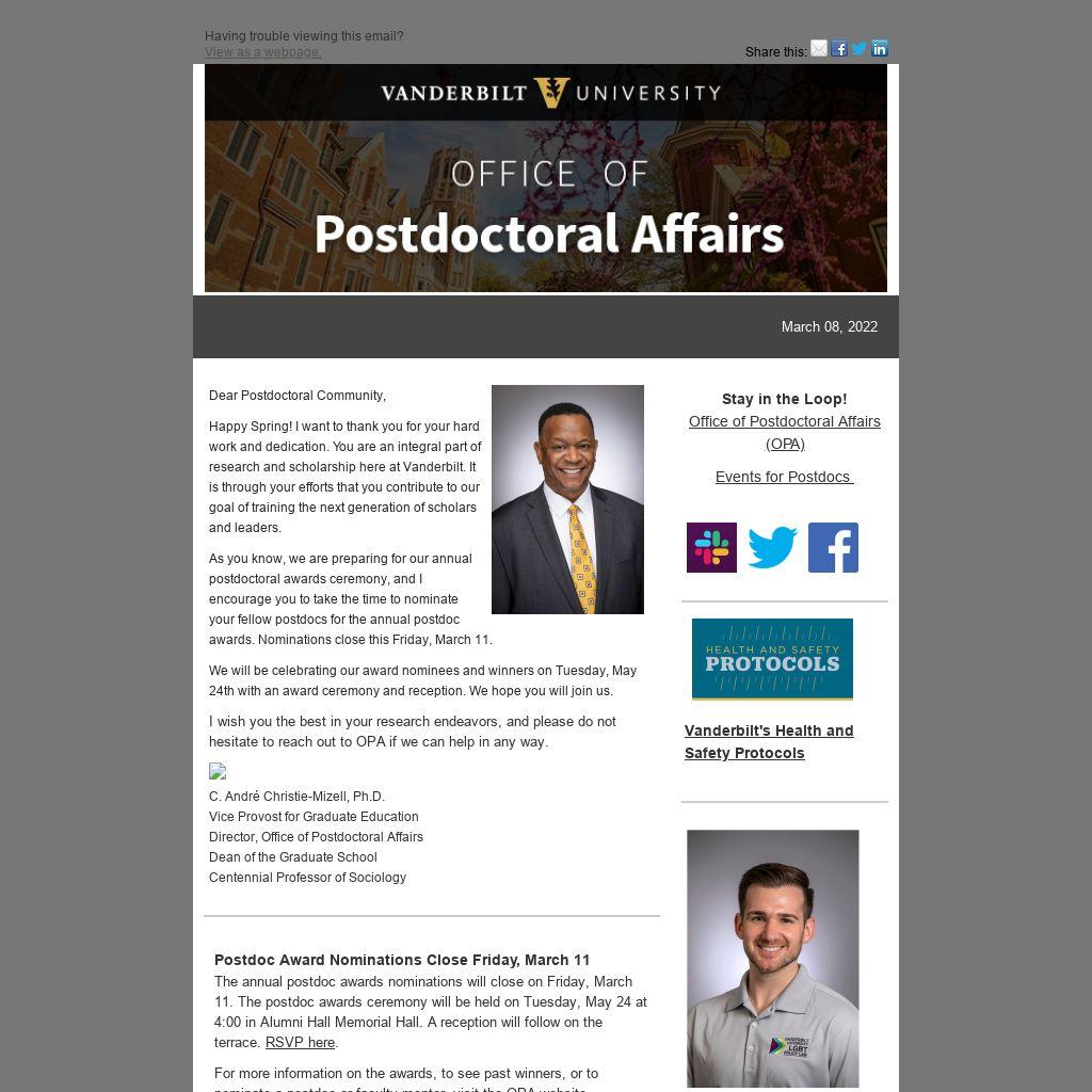 Happy Spring! I want to thank you for your hard work and dedication. You are an integral part of research and scholarship here at Vanderbilt. It is through your efforts that you contribute to our goal of training the next generation of scholars and leaders.