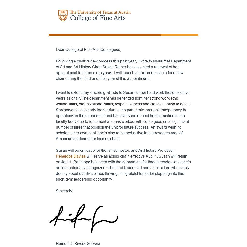 Following a chair review process this past year, I write to share that Department of Art and Art History Chair Susan Rather has accepted a renewal of her appointment for three more years. I will launch an external search for a new chair during the third and final year of this appointment.